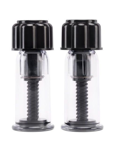 Пара вакуумных стимуляторов для сосков из пластика. Крупные, из черного и прозрачного прочного пластика. Вакуум создается путем выкручивания поршня за крупную черную головку стимулятора.